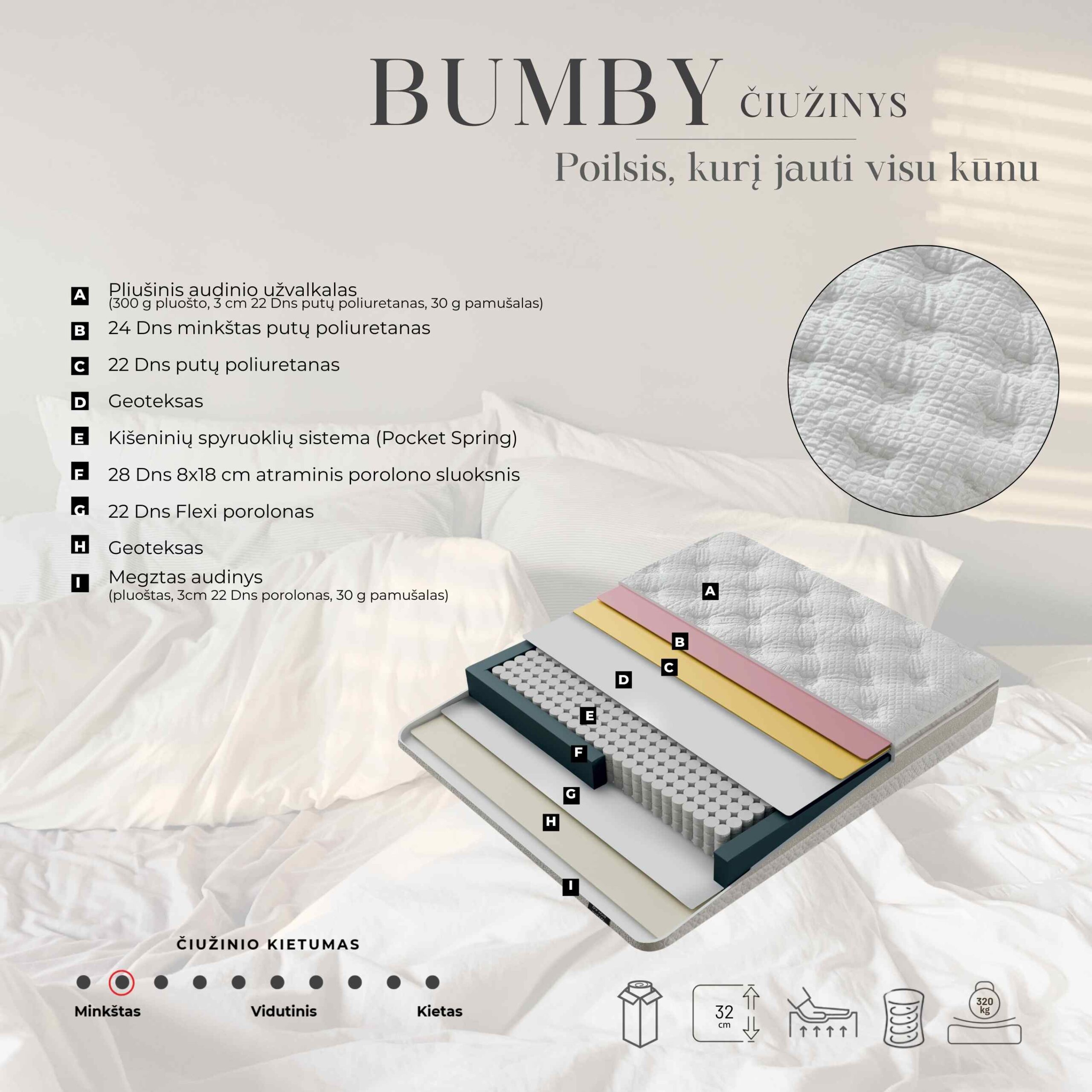Čiužinio paviršiuje naudojamas specialus švelnus, pliušinis audinys. Šis specialus audinys, pagamintas iš medžiagų, kuriose yra daug pluošto. Čiužinio BUMBY sudėtyje yra kišeninių spyruoklių technologija ir veltinis, apsaugantis viršutinius minkštus komforto sluoksnius. Kišeninių spyruoklių technologija užtikrina patogų miegą, palaikydama kūno išlinkimus, o komforto sluoksniai padidina Jūsų miego patogumo lygį.