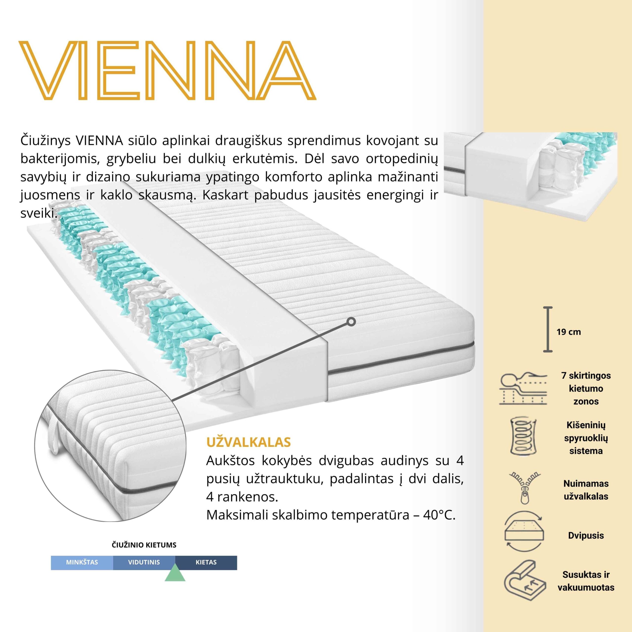 Čiužinys VIENNA siūlo aplinkai draugiškus sprendimus kovojant su bakterijomis, grybeliu bei dulkių erkutėmis. Dėl savo ortopedinių savybių ir dizaino sukuriama ypatingo komforto aplinka mažinanti juosmens ir kaklo skausmą. Kaskart pabudus jausitės energingi ir sveiki.