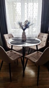 Puikus komplektas, gera kokybė. Stalas tvirtas, kėdžių veliūras malonus sėdėti. Džiaugiamės įsigyję su tokia nuolaida😊